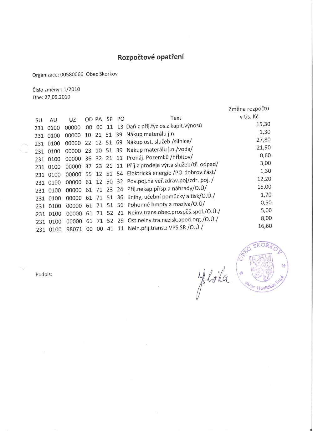rozpočtové opatření projednané 27.5.2010