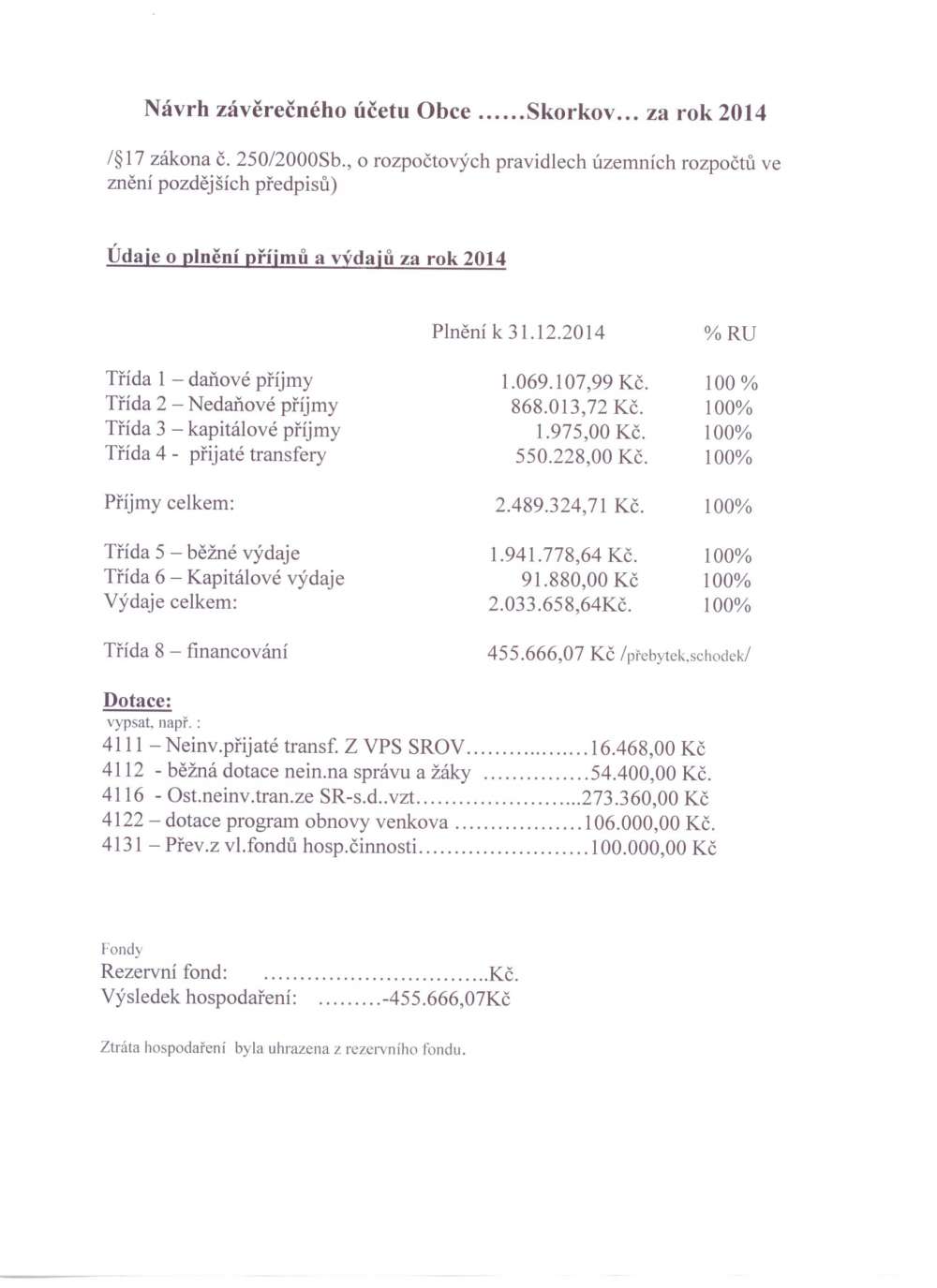 Návrh závěrečného účtu obce Skorkov za rok 2014