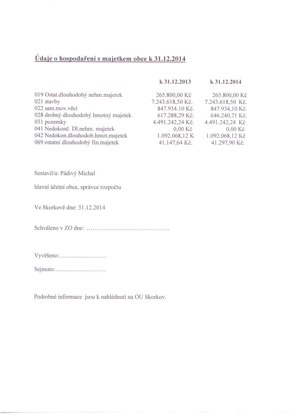 Údaje o hospodaření s majetkem obce k 31.12.2014