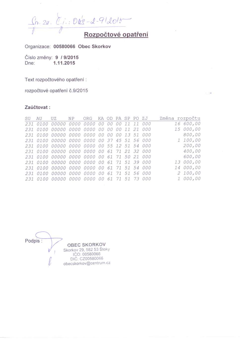 Rozpočtové opatření 9/9/2015