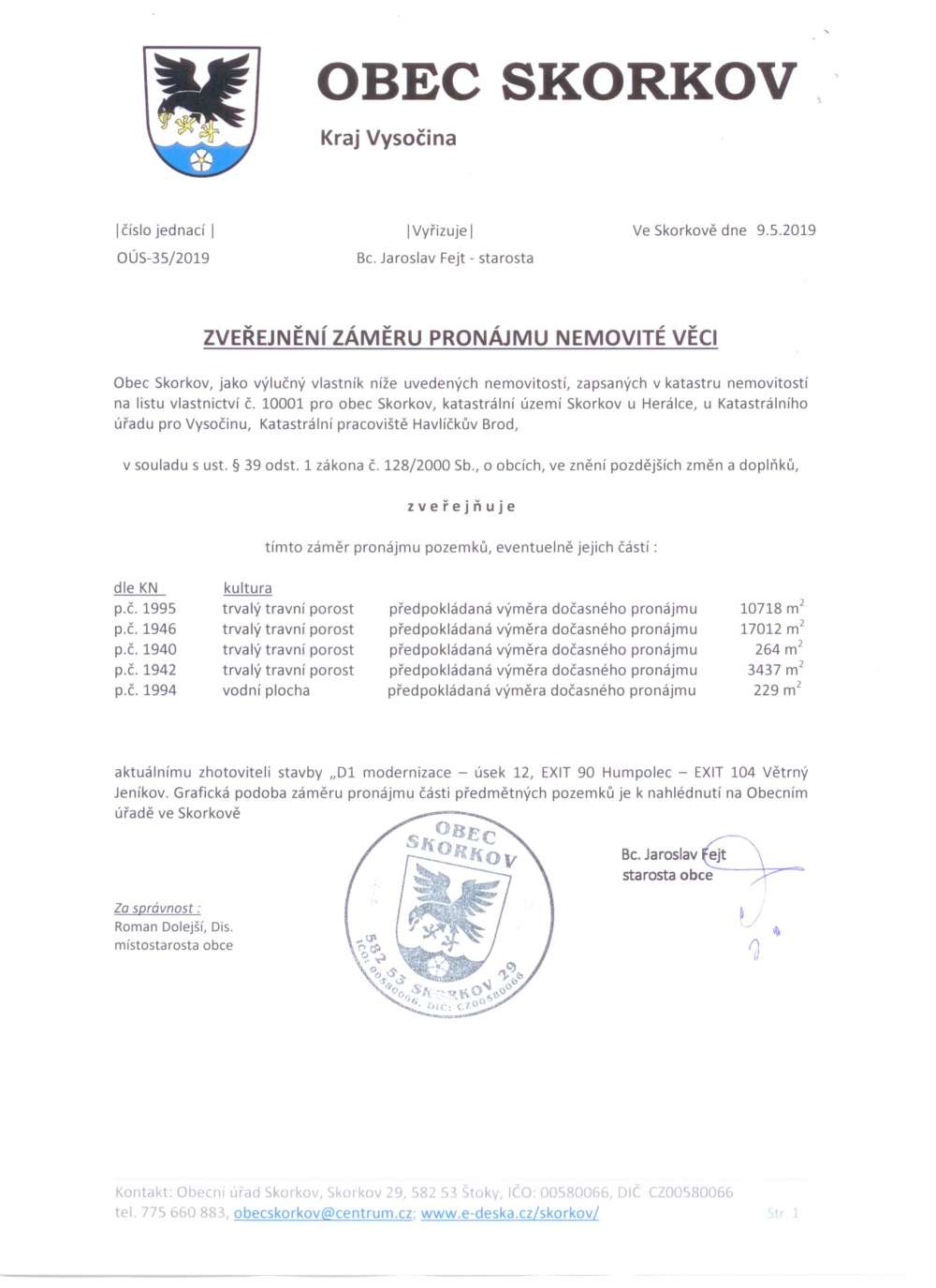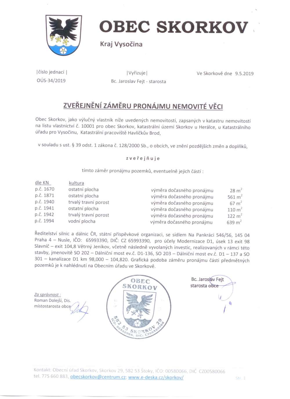 Záměr pronájmu nemovité věci - zhotoviteli modernizace D1